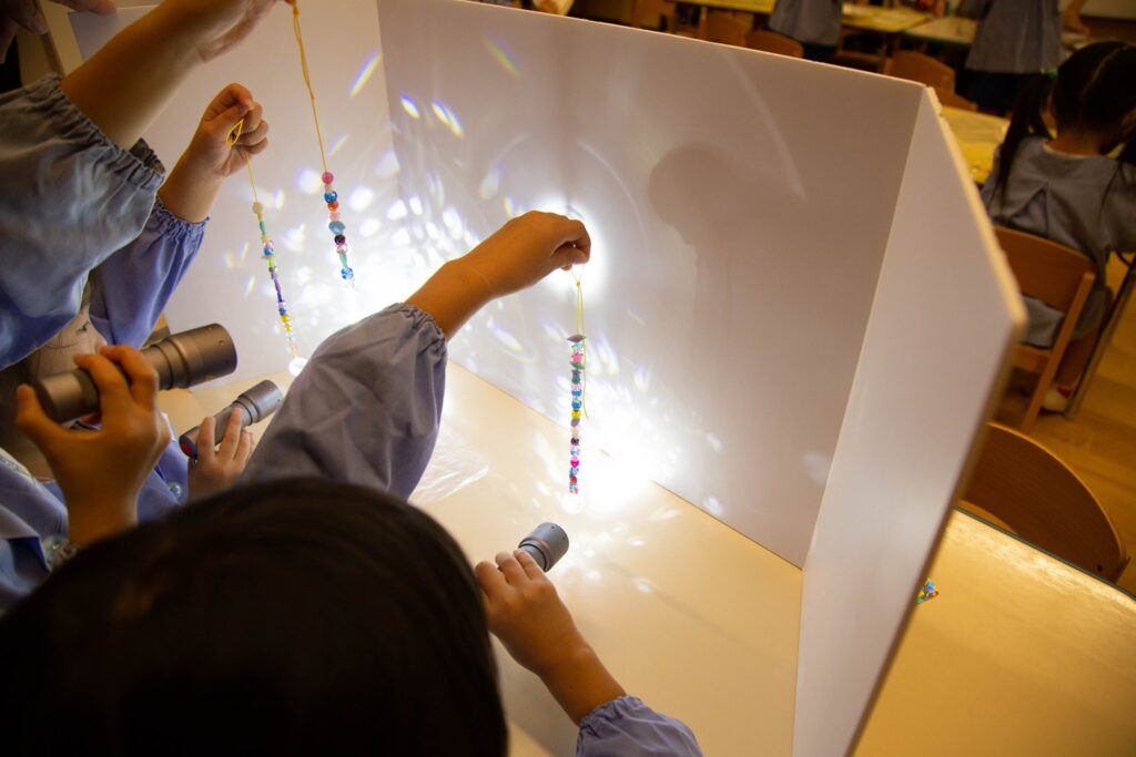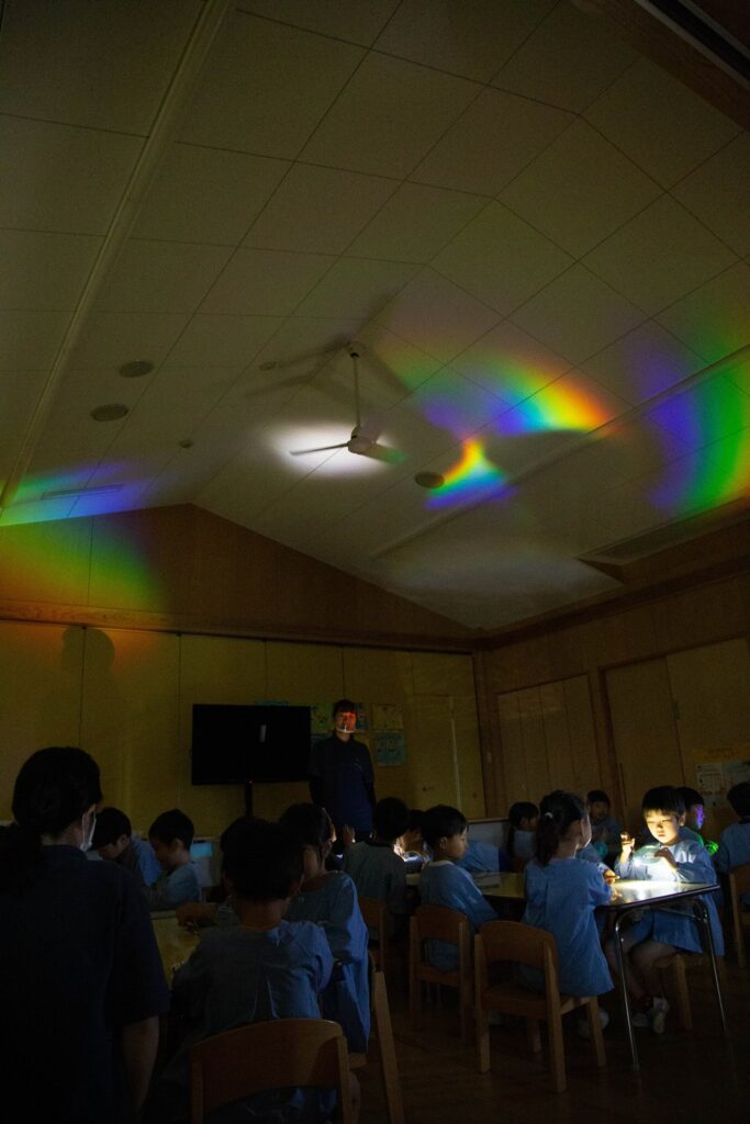 さて、太陽にまつわるお話がとてつもなく長くなりましたが、弊社の幼保向け科学実験サービス『かがくあそび』では、光の実験【サンキャッチャー】を取り扱っております。