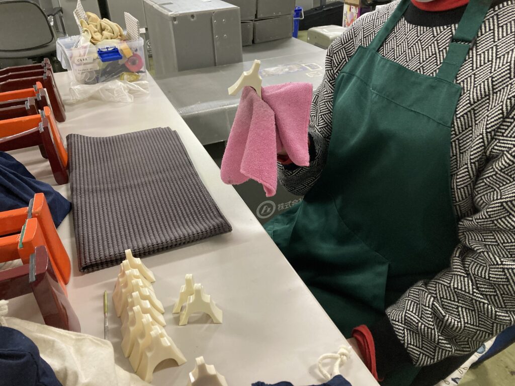 井出さんがメンテナンスしている象牙色の小さい足のようなものが「」です。柱は落としたり倒れたりすると欠けることがありますので、このようにひとつひとつ検品をしながら拭き上げ作業を行っております。この柱を立てて調弦していくのですが、柱の位置を変えると音程も変わります。箏の演奏する側の方を龍頭(りゅうとう)というのですが(かっこいいですよね)、龍頭側から柱を離せば離すほど音程は低くなります。逆に近づけると音は高くなります。