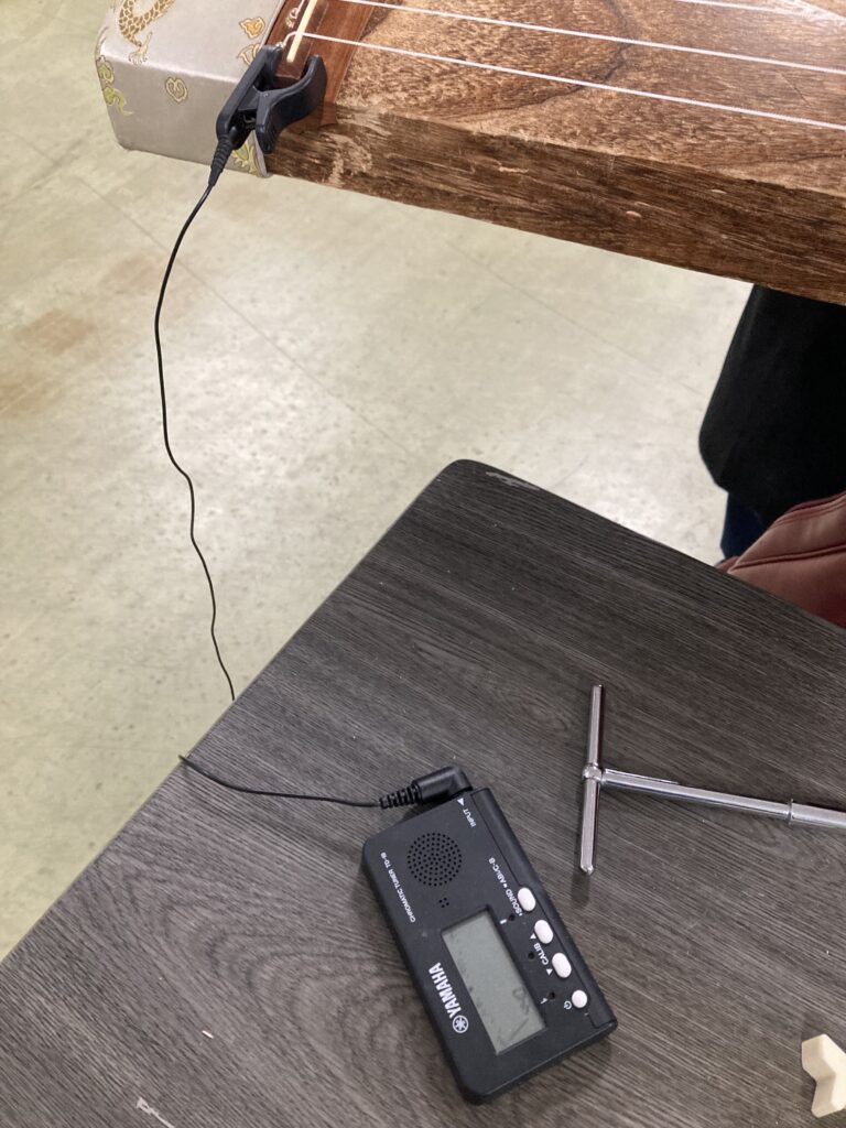 こんな感じでチューナーをつけて調弦をしております。弊社の箏は平調子(ひらぢょうし)で調弦を行っております。箏の調弦ってどんなふうにやるの?と思われるかたもいらっしゃるかもしれませんが、基本的には柱を立てて音の高さを調節していきます。