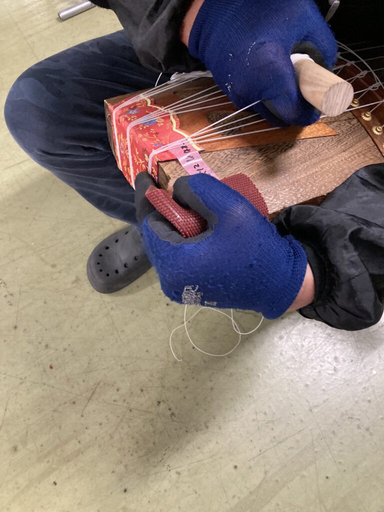 これは三味線や三線も同じです。馬場さんのメンテナンス講習を受けたときに、弦の伸ばし方なども教えてもらいました。弦は温度や湿度で簡単に伸びたり縮んだりします。レンタルから返ってきたばかりの弦は縮んでいることが多いので、まず13本すべての弦を丁寧に伸ばしていきます。ここで伸ばしておかないと、後で音がずれてしまうんですね。弦の劣化がないかどうかの確認にもなります。そのあとに柱を立てて音の高さを調整していくというわけです。