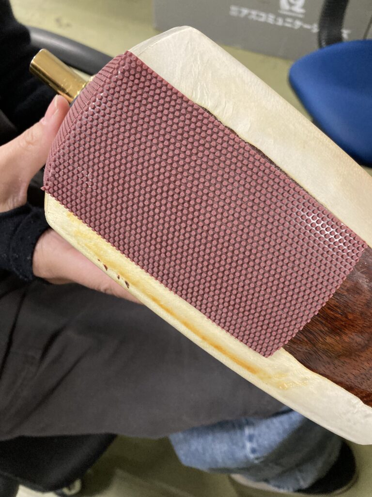馬場さんの三味線にも当然トチがたくさんありましたよ…! 何と言いますか、とてもきれいな棹でした。そうそう、三味線って「三つ折」といいまして分解できるのです。馬場さんも分解して持ち運びをしているのですが、我々恐れ多くも胴を持たせてもらったんですね。日頃は細棹のメンテナンスばかりなものですから、太棹の胴はとても重く感じました。そのため、馬場さんの胴にはこんな感じで滑り止めがついています。