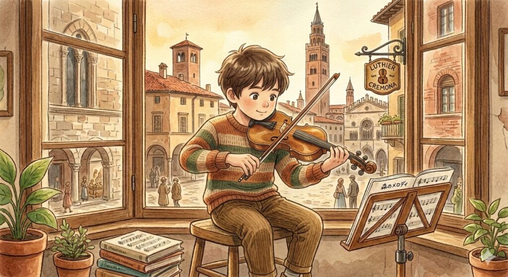 この男の子はイタリアのクレモナに留学したようなのですが、クレモナはヴァイオリン制作専門学校があるほど、ヴァイオリン職人を目指す人たちにとっては超有名なところです。人口は10万人に満たないこぢんまりした町ですが、工房の数はとても多く、名工として知られるアントニオ・ストラディバリもクレモナで楽器制作をしていたとのこと。そう、このアントニオさんこそが弦楽器に詳しくない人でも知っている「ストラディバリウス」を作った人です。彼の作品のことを「ストラディバリウス」と呼んでいるのですが、現在では約600ほど現存しているそうです♪ とても貴重…!
