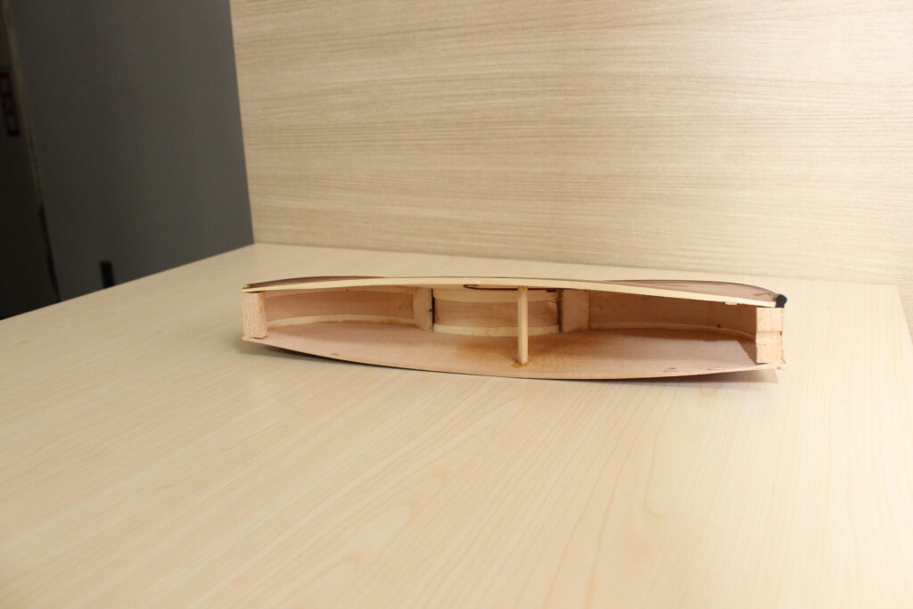 音の出口になるf字孔(エフじこう)もこのときに開けまして、ボディの組み立てが終わりましたら中に「魂柱(こんちゅう)」や「バスバー」を取り付け、音の振動をコントロールできるようにします。