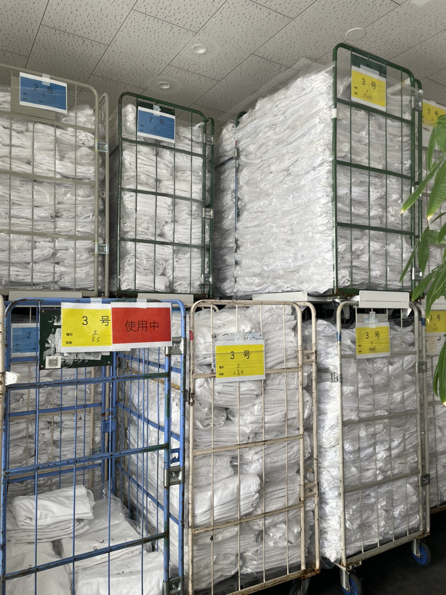 こちらの画像は実際に全国の学校さんへ柔道着を配送してくださっている業者さんの倉庫の様子。たくさんの道着が綺麗に並んでいるのがお分かりかと思います。このように一枚一枚丁寧にチェックしたものをお送りしております。